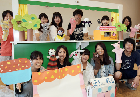演じるのは社会福祉学部子ども福祉専攻の4回生42人。保育実習の一環で3回生の秋から人形劇に取り組んできた。古着やタオルなどを利用して各自1体ずつ手袋式の人形を制作。5〜6人の班ごとにオリジナルの物語を考え、昨冬には市内の幼稚園で出張公演も行った。始めは恥ずかしさがあった学生たちも、園児が見せる笑顔に喜びを覚えるようになった。