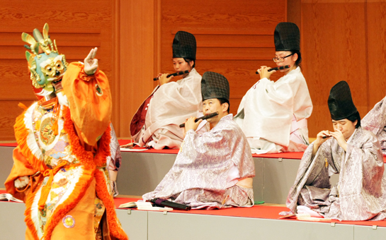 晴れの舞台へ上がったのは、部長の葛島星さん(17)と管長の明石麻友子さん(17)=いずれも3年=。烏帽子と直垂を着けて他の楽人たちと並び、笠置さんが叩く鞨鼓を合図に龍笛を吹いた。南都楽所楽師補でもある永井信行顧問(43)がきらびやかな衣装と面を着け、古式ゆかしい調べに乗って荘厳な舞いを披露した。