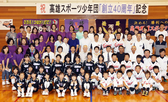 式典は高雄地区体育館であり、野球少年団の高岸光芳団長(54)=中山=が「今後も伝統を守りながら頑張っていきます」とあいさつ。少女バレーの西本昇一団長(57)=周世=は「気持ちを新たに、子どもたちの心と体を育てることに努力したい」と抱負を述べた。