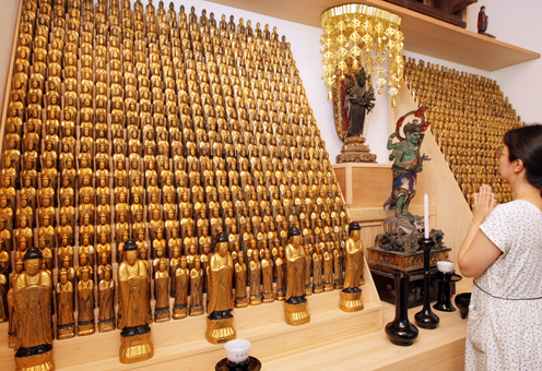 昨年8月、千躰観音を本堂へ仮置きし、同寺護持会の前川渉会長(80)=中広=が一体ずつ丁寧に洗浄。長年積もったほこりを洗い流して胴体部に貼られた金箔の光沢をよみがえらせ、頭部と足元を金色に塗り直した。並行して老朽化が目立っていた報恩堂の壁を改修。従来は石段から畳へ上がっていた内部の構造を、靴を脱がずに参拝できるよう土間に変更した。