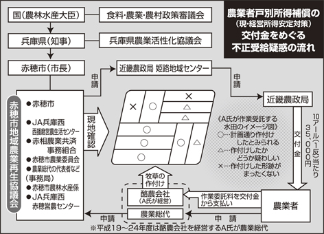 申請どおりに作物が栽培されているかどうかについては毎年7月1日を基準日として、市とJA、赤相農済などで構成する「赤穂市地域農業再生協議会」が現地確認する取り決めだ。協議会事務局の市農林水産係は「現地確認は耕地を一筆ずつ目視するのが原則だが、高野地区ではこれまでしていなかった。書類と農業総代への聞き取りで確認を済ませていた」と明かした。同地区の農業総代は平成19年度から昨年度までA氏が務めており、“現地確認”はA氏の会社事務所で行われていたという。同係は「現地確認が甘かった点は否めない」とうつむいた。