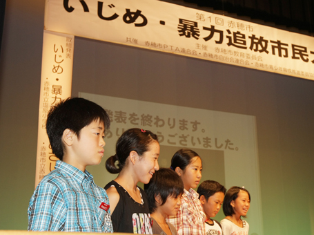 会場の小ホールには児童と生徒、PTA、後援団体など約400人が集まった。子どもたちによる実践発表に続き、「私たちは『仲間の力』で必ずいじめや暴力を追放し、みんなが笑顔で通える学校をつくっていくことをここに宣言します」などとする生徒起案の大会宣言を満場の拍手で採択した。