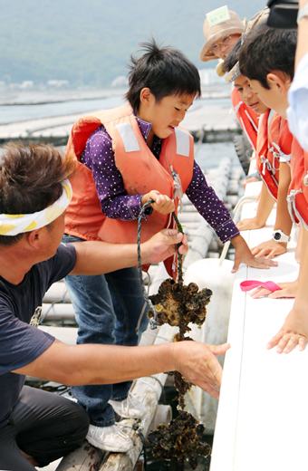この日は同地区の「ひょうご森のインストラクター」8人を案内役に宝珠山をハイキング。漁船で坂越湾へ出航し、カキの養殖いかだを見学した。今春に種付けしたマガキが連なるロープを引き上げる体験もあり、子どもたちは船から身を乗り出して観察した。