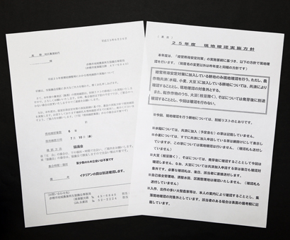 「確認票」は交付金申請があった農地一筆ごとに発行されるA5判くらいの大きさの紙片。現地確認を担う「赤穂市地域農業再生協議会」から受け取った確認票を各地区の農業総代が申請者へ配布し、定められた期日までに農地に掲示する取り決めになっている。しかし、同地区では牧草(イタリアンライグラス)の転作計画地について目視による確認を行わず、書類確認と農業総代への聞き取りで済ませることが慣例化。確認票の掲出も求めていなかった。