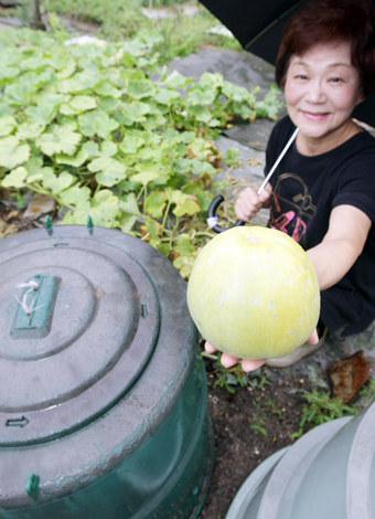 思いがけず実った「ごほうびメロン」に笑顔の稲場京子さん。手前左がコンポスト器