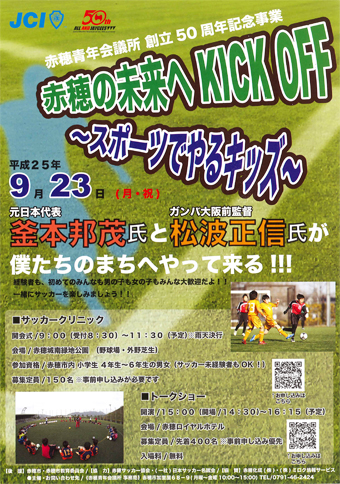 創立50周年記念事業として、日本が銅メダルに輝いたメキシコ五輪の得点王、釜本邦茂氏(69)とガンバ大阪前監督の松波正信氏(38)の2人を講師に迎える。