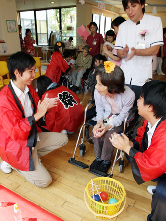 早期退院への意欲を高めてもらおうと、長期のリハビリに取り組んでいる入院患者4人を招いた。近くにある「西はりま医療専門学校」からは実習生2人と学生ボランティア6人がスタッフとして参加。赤いはっぴを着てイベントを盛り上げた。