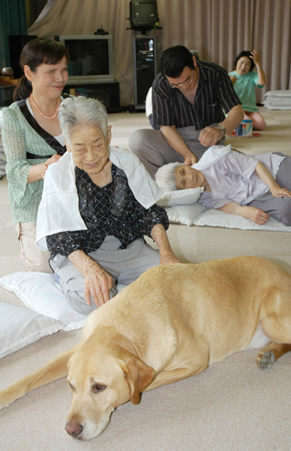 気持ちよさそうにマッサージを受ける利用者のみなさん。手前は盲導犬