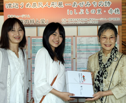 同ミュージアムの桃井香子代表(70)から赤穂雲火焼の陶器皿を記念品として受け取った彩歩さんは平成生まれ。「私の知らない昭和の暮らしを、人形を通して感じたいです」と見学。御加さんは「有年考古館の会場も見に行きたい」と話していた。