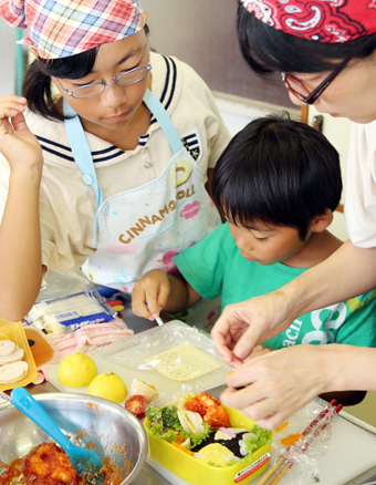 海苔や梅干しで「陣たくん」を表したキャラ弁、薄焼き卵と丸くくり抜いたチーズを満月と月見団子に見立てた秋らしい作品も。栄養士や調理専門学校の指導者など4人が試食した。結果は10月19日(土)の「あこう食育フェア」で発表される。