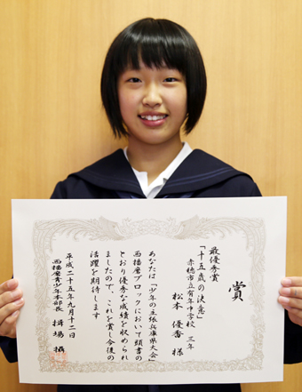 松本さんの発表タイトルは「十五歳の決意」。いじめ問題に向き合い、自分なりに見つけた答えを400字詰め原稿用紙4枚に記し、初めて応募した。1528点が寄せられた地区選考で最優秀賞に選ばれた。