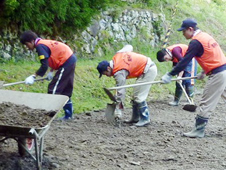 崩れた裏山から土砂が本堂に流入した美山町樫原地区の永照寺には20人を投入。地元住民約15人と力を合わせて床下や側溝から泥を取り除き、廊下や建具を水拭きした。