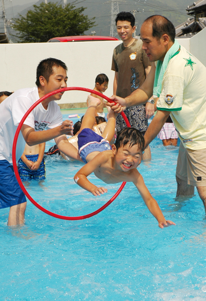 板と古タイヤの手作りいかだをプールに浮かべて水遊び。父親らが勢いよく上下に揺らすと、乗っている子どもたちから歓声が上がった。