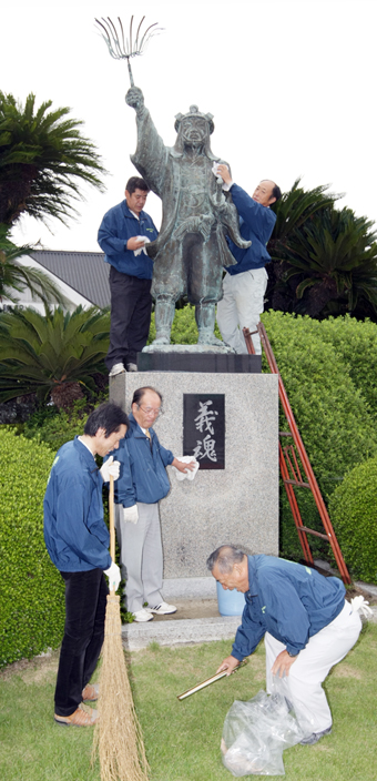 大石内蔵助像(20周年)、花時計(福島LC姉妹提携記念)がある加里屋のJR播州赤穂駅南ロータリーでは約10人が銅像の汚れを拭き取り、周辺のごみを拾った。
