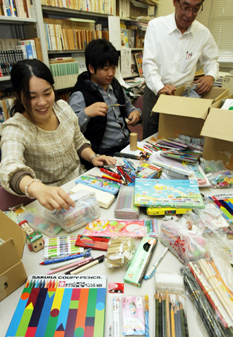 フィリピンの子どもたちへ贈るために寄せられた文房具の仕分け作業