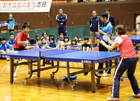 ラリー練習でスマッシュを決めた赤穂中卓球部2年の金家弘明君(13)は「ドライブを打つときのスタンスがわかった」と一流選手のアドバイスに目を輝かせた。