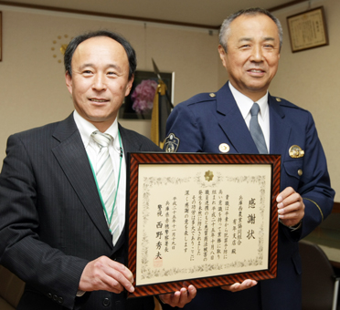 悪質商法被害を未然防止した功績で西野秀夫署長(右)から感謝状を贈られた兵庫西農業協同組合有年支店の竹元康久支店長