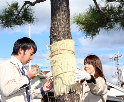 お城通り沿いで行われたクロマツの「こも巻き」