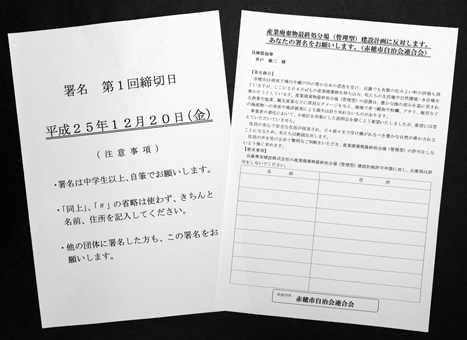 産廃処分場計画の阻止を求める赤穂市自治会連合会の署名用紙