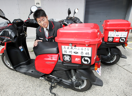 「忠臣蔵のふるさと」をアピールしようと家紋ステッカーを貼った郵便バイク