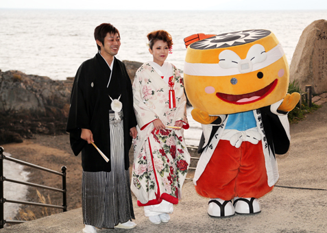 親族約20人が参列し、和装の新郎新婦が拝殿で挙式。赤穂の観光マスコット「陣たくん」も祝福に駆けつけた。「日本の夕陽百選」にも選ばれた海岸線を背景に記念撮影。柔らかな日差しが二人を照らした。