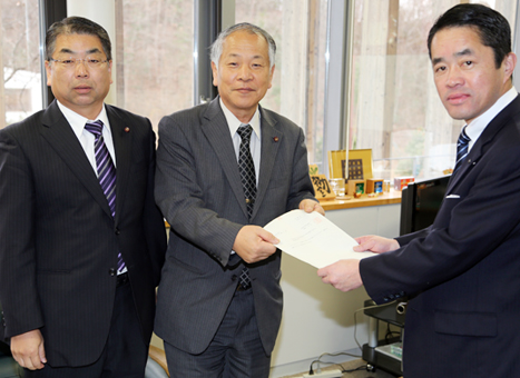 産廃最終処分場設置計画に反対の意見書を提出する永安弘議長=中央=と前川弘文副議長=左=