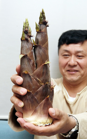 ▼珍しい双頭タケノコ=尾崎の竹林で先端が2本に分かれたハチク。元塩町の市職員、児島進さん(53)が見つける