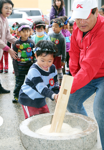 加里屋中洲の中央公民館で開いた赤穂地区会場では小1児童、園児ら計約230人も参加。「よいしょ」と掛け声に合わせ、湯気の立つおもちに一人3回ずつ、きねを振るった。赤穂幼稚園の金田愛斗ちゃん(5)は「上手につけた」と楽しそうだった。