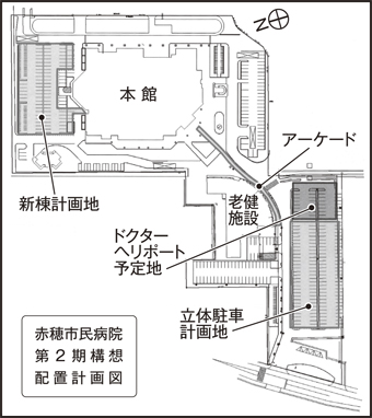 構想によると、新棟は本館北側の駐車場を建設予定地とし、鉄骨造4階建て、延床面積約6140平方メートル。悪性腫瘍の画像診断に効果を発揮するPET装置、健診センターなどを備える。本館から移す人工透析室は現状の30床から50床に拡充。浸水対策として機械室、電気室を最上階に設置する。