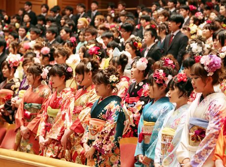 色鮮やかな晴れ着姿が目立った成人祝賀式
