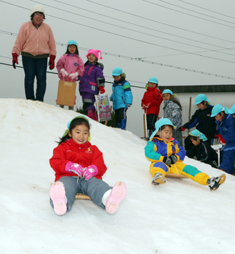 毎朝、先生に雪遊びの日を尋ねて楽しみにしていたという年少組の野中彩恵(さえ)ちゃん(4)は「こんなにたくさん雪を見たのは初めて。そりはすごく速かった」と大喜びしていた。