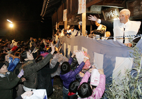 同神社が「節分」に行う吉例行事。坂越の照峰賢也君(11)ら小学生から大人までの年男と年女8人が絵馬堂に並び、神前の供えた小袋入りの豆20キロ分と丸餅、ミカンなどを次々と放り投げた。境内には福を授かろうと約200人が集まり、降ってくる豆を手提げかばんやビニール袋を広げて受け止めた。