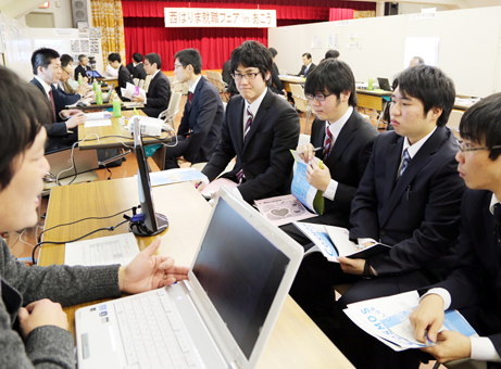 採用面接さながらに姿勢を正して自己紹介する若者や、一つのブースで30分以上かけて熱心に話を聞く学生の姿も。故郷での就職を希望している鳥取大学3回生の豊田成美さん(21)=宮前町=は「大学に求人票がきていない会社も参加していて参考になります」とブースを回っていた。