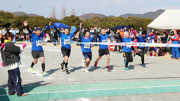 すべてのチームが完走。20〜60代のジム仲間14人で出場した「パワーハウスAKO」は全員で肩を組んだり手をつないだりしてゴールした。スポーツトレーナーの山内裕美さん(26)=上郡町=は「順位とか気にせず、一緒に完走を目指して走りました」とメンバー同士の触れ合いを喜んでいた。