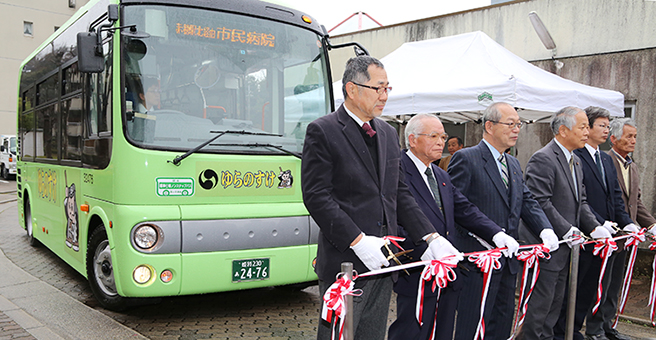 出発式は「みどり団地」バス停のすぐそばで行われ、豆田正明市長が「ゆらのすけの利用率は県下でも高く、市民の足として定着したと思っている。バス自体をふれあいの場として利用してほしい」とあいさつ。自治会役員、老人クラブ会長らとテープカットして第一便の出発を祝った。塩屋西北自治会の植村洋輔会長(69)は「国道沿いのバス停まで出なくてもよくなるのでありがたい」と歓迎していた。