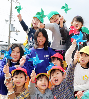 年長組の鍛治芽衣ちゃん(6)は「お兄ちゃんたちといっぱい遊べて楽しかった」とうれしそう。たこ揚げで園児を喜ばせた関宗一郎君(13)は「笑っているのを見ると、つられて笑顔になりました」とにこやかだった。