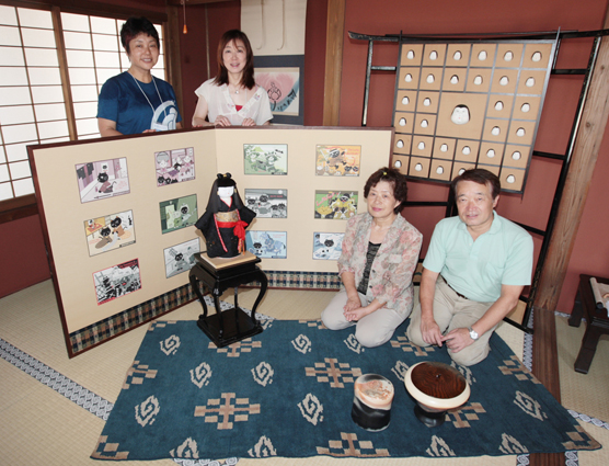 会場の旧坂越浦会所は市指定文化財。和室に置かれた作品は、庭や窓からの景色と調和してゆったりとした雰囲気を醸し出している。