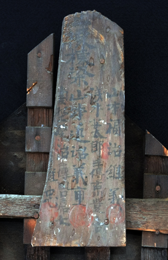 棟札は解体に伴う建造物調査で見つかった。東側妻壁の格子裏に内側から釘で打ち付けてあり、縦約25センチ、横約11センチの五角形。左端部が欠けているとみられるが、「上棟棟梁 山本近治義重」「山本福治維義」「浅木安太郎」「古川豊吉」「田口嘉七」といった人名が読み取れる。