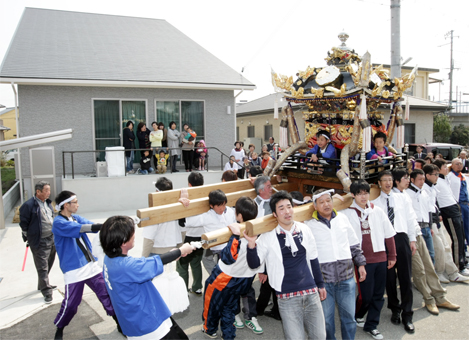 屋台も繰り出した塩屋向自治会館=左奥=の竣工式