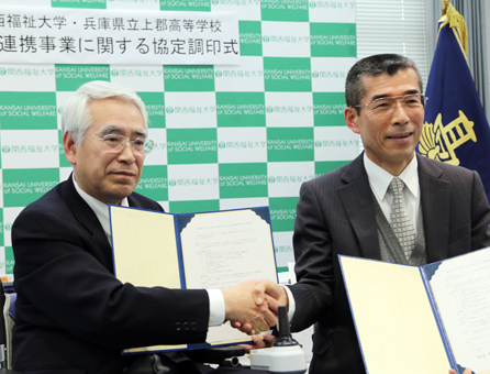 高大連携協定に調印し、握手する関西福祉大学の安井秀作学長(左)と上郡高校の松崎隆幸校長