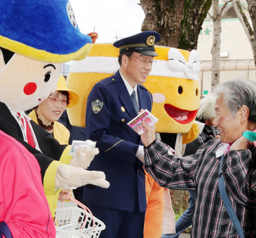 交通安全協会の会員ら約70人が市内のスーパー駐車場で横断幕やのぼりを掲げ、啓発チラシの入ったポケットティッシュを買い物客に手渡した。「交通安全運動出発式」を行い、白バイやパトカーなどがパトロールへ向かった。