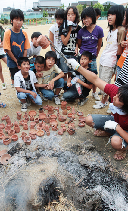 いずれも素焼き特有の赤茶やいぶし銀に窯変し、焼成前よりも作品の個性が際立った。小物入れを作った谷口彩さん(11)は「思ったよりも黒っぽくなった。縄文時代の人もこうして作ったのかな」と古代に思いをはせていた。
