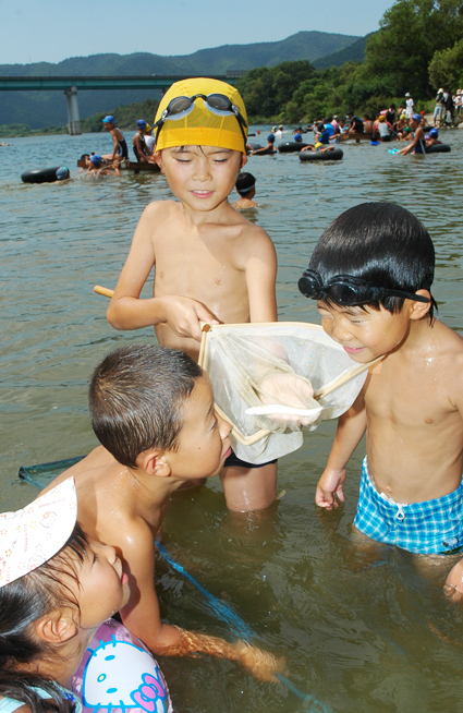 普段は遊泳禁止の水辺だが、この日は主催した高雄地区水辺づくり協議会と父親クラブの大人たちが見守り、子どもたちは安全に川遊びを楽しんだ。