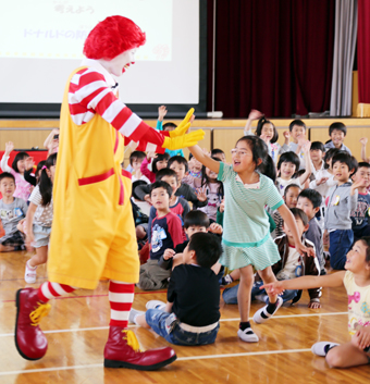 日本マクドナルドは子どもたちの安全を守ろうと、小学校の新入生に防犯笛を配る活動を平成15年度から続けている。防犯教室もその一環で、赤穂市内では初めて行われた。ドナルドは赤と白のしま柄のシャツ、黄色いつなぎといったおなじみの姿で登場。赤穂フレスポ店の小林和之店長を交えた寸劇で「知らない人に声をかけられてもついていかないで」などと呼び掛けた。