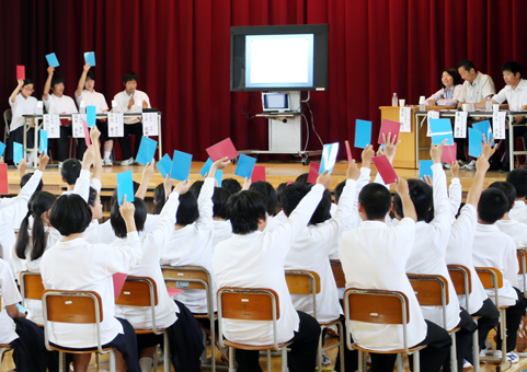 後半は、困っている友人への接し方や級友間の悪ふざけを題材に生徒会役員が寸劇を演じた。客席側の生徒たちは登場人物の発言や行動の善し悪しについて、一人ずつに配られた青と赤のカードで意思表示。思いやりを持つことや、いじめのない仲間作りの大切さについて考えを深めた。