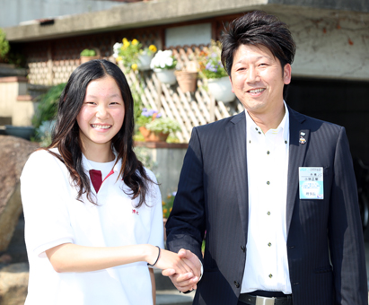 赤穂JCの小林正樹理事長の激励に笑顔で応じる清水理央さん
