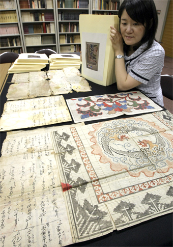 寄贈者は、大正4年に「新船緞通」を創業した新船善平氏の孫、岡崎佳世さん(61)=御崎=。緞通工場だった建物を改修した自宅の納戸で綿糸や染料と一緒に木箱に納めて保管されていた図面を見つけた。「公的に活用してほしい」と、「赤穂緞通を伝承する会」を通して平成21年度と24年度に2回に分けて寄贈した。