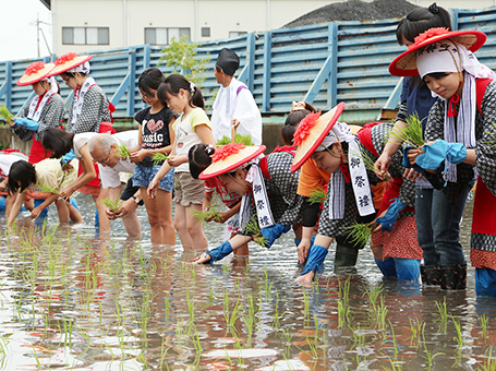 飯尾義明宮司(65)が祝詞を奏上。菅笠と着物で早乙女に扮した関西福祉大の女子学生10人が横一列に並び、太鼓の合図に合わせて早苗を植えた。早朝に降っていた雨は神事が始まるまでに上がり、見物人からも希望者が素足で斎田に入って早乙女と一緒に手植えした。