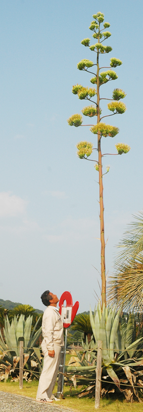 アオノリュウゼツランはメキシコ原産の常緑多年草でテキーラの原料として知られる。英語では100年に一度しか咲かないとの意味で「センチュリープラント」と呼ばれるほど開花は珍しい。