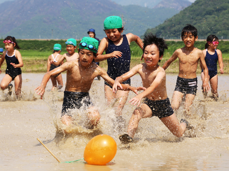子どもたちは水着に靴下をはいて田んぼの中へ。最初は大人しかった児童も途中からは開き直ったように全身泥まみれになった。チーム対抗リレーで頭から滑り込んでゴールし、「スライディング大賞」に選ばれた古谷成(こたに・なる)君(8)は両足とも靴下が脱げてしまうほど激走。「はだしの方が気持ちいい」と派手にしぶきを上げて駆け出した。
